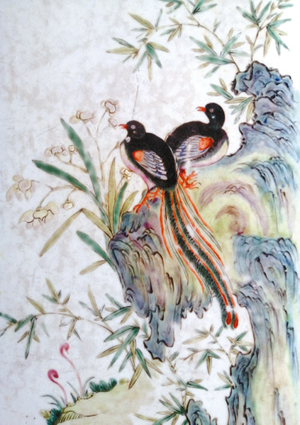 石磊的藏品中,他很喜欢一块直径40厘米的瓷板画。画中双绶带鸟栖于梅枝,尾羽如飘带般垂落,与竹叶、山茶花构成“齐眉祝寿”图景。这种艺术表现绝非偶然,其文化基因深植于中国传统纹样体系。