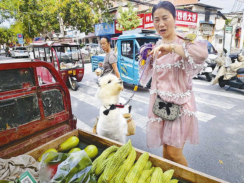 记者看到,羊驼在街头成了绝对的“焦点”。它通体雪白,毛发蓬松柔软,还系着精致的小领结,背上的小竹筐里装着青草,模样十分可爱。羊驼的出现,让本就喧闹的市场更添几分热闹。
