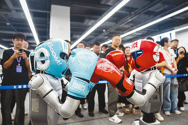 9月15日,在湖南湘江新区长沙智谷,两台人形机器人在进行拳击表演。