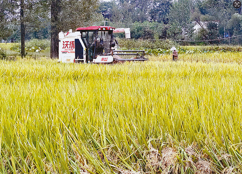 近日,在正阳县大林镇蔡庄村,稻农忙着开展水稻收割、晾晒工作。近期,正阳县南部稻区的水稻陆续成熟,当地稻农充分利用晴好天气,抓紧时间在田间抢收水稻,全力保障粮食颗粒归仓。