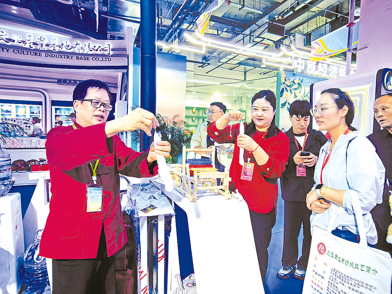 展馆内,河南布老虎非物质文化遗产代表性传承人王彩红指尖翻飞,花布、毛线在她手中神奇地变成活灵活现的布老虎。“让我试试!”年轻观众张先生兴奋地在王彩虹手把手指导下,尝试制作布老虎。