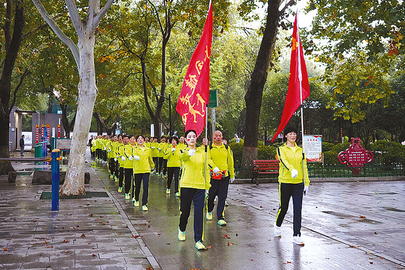 9月30日清晨,驻马店市区儿童公园内红旗飘飘、笑语飞扬,儿童公园公益健走队在此举办“迎国庆花样健走”活动。队员们灵活变换队形,用灵动的步伐演绎运动之美。