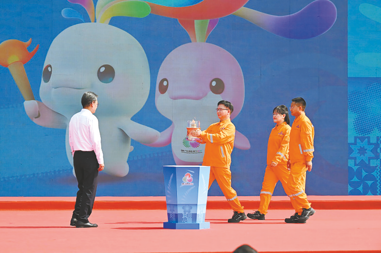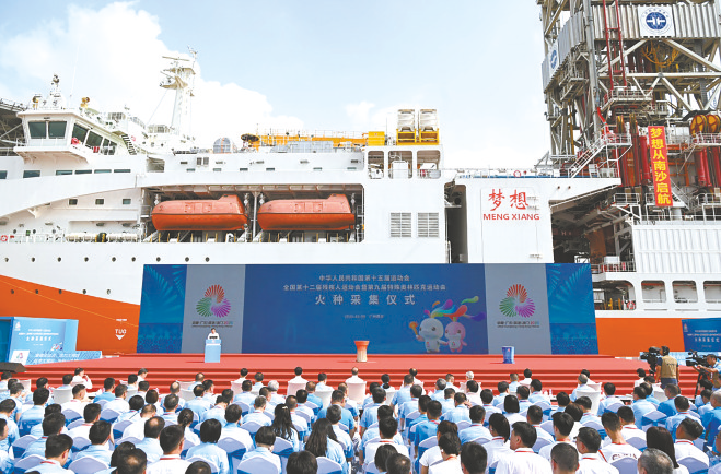 10月9日,第十五届全国运动会、全国第十二届残疾人运动会暨第九届特殊奥林匹克运动会火种采集仪式在广州举行。全运圣火“源火”来自南海1500多米深海底,通过引燃可燃冰的方式获取。 相关报道见A8版