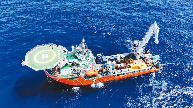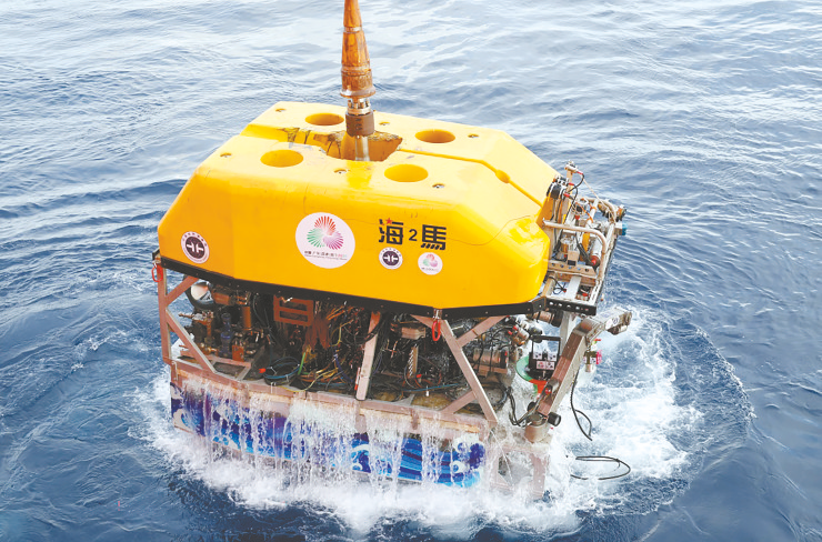 “海洋地质二号”科考船搭载“海马”号深海遥控潜水器在南海北部进行“源火”采集(9月18日摄)。 新华社记者 卢汉欣/摄