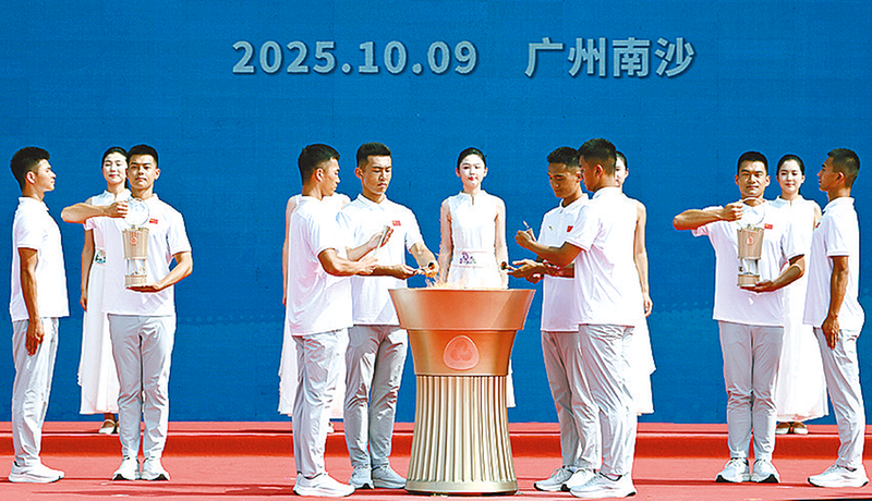 10月9日,火种护卫将火种从火种盆引入火种灯。 新华社记者邓华/摄 新华社广州10月9日电(记者 王浩明 田宇)深海逐梦,燃冰成炬。9日,第十五届全国运动会和全国第十二届残疾人运动会暨第九届特殊奥林匹克运动会火种采集仪式在广州举行。