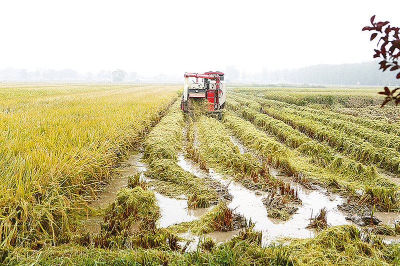 10月12日,在确山县留庄镇的稻田里,稻农雇用收割机抢收水稻。稻田泥泞,“小坦克”一样的收割机在稻田里快速穿梭,粒粒稻米进入车厢。农民说,附近的工厂有烘干设备,可以将稻米快速烘干,解了他们的心头之忧。