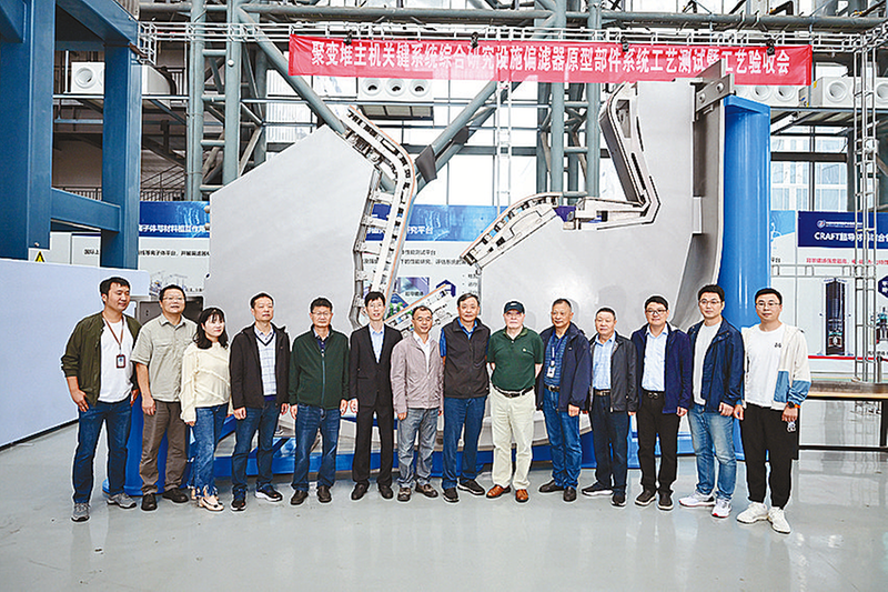 10月13日,专家组和科研团队在聚变堆主机关键系统综合研究设施“夸父”(CRAFT)偏滤器原型部件测试现场合影。 新华社记者 周牧/摄 新华社合肥10月13日电(记者 戴威)13日上午,聚变堆主机关键系统综合研究设施“夸父”(CRAFT)取得重要进展——偏滤器原型部件顺利通过专家组测试与验收。