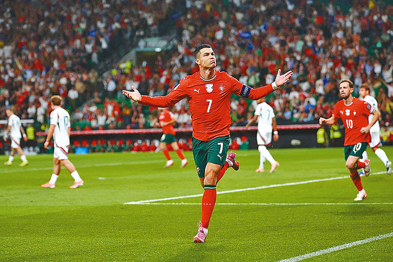 10月14日,葡萄牙队球员克·罗纳尔多在比赛中庆祝进球。
