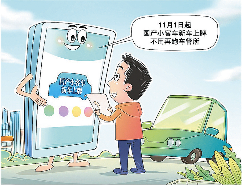 公安部近日在京召开新闻发布会介绍,11月1日起在全国全面推行国产小客车新车上牌“一件事”服务,推动车辆销售发票、购置税、保险等信息共享核查,实现国产小客车新车上牌全业务数字化办理,群众免予提交纸质材料,办事时间将从线下2个多小时压缩至线上半小时内。