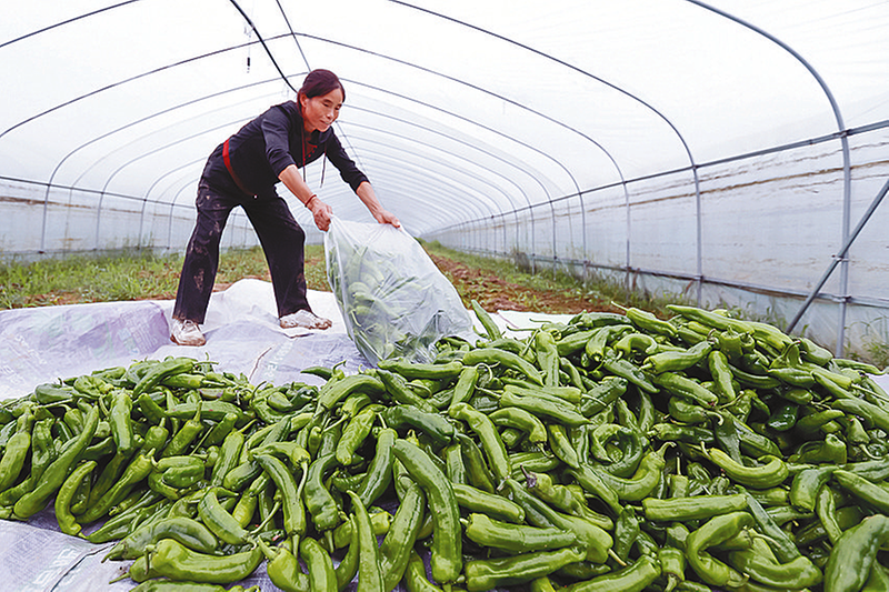 近日,在正阳县王勿桥乡新丰村蔬菜大棚基地,农户正在采收辣椒。全村200多座大棚规模化发展蔬菜产业,通过“基地+农户”模式,有效带动村民实现家门口就业与增收。