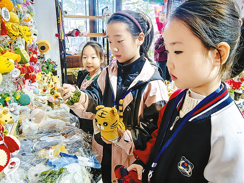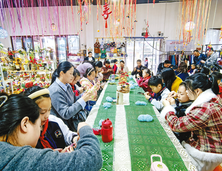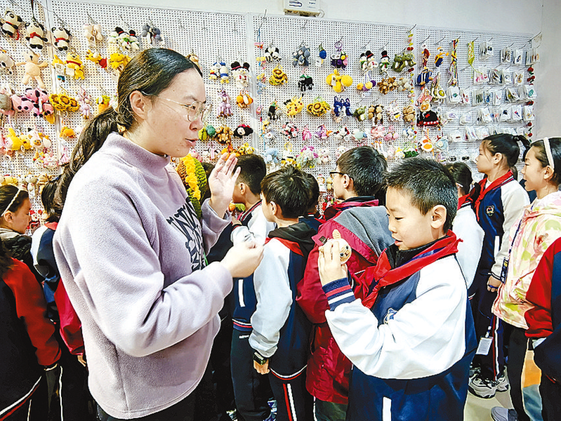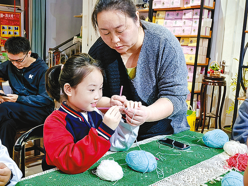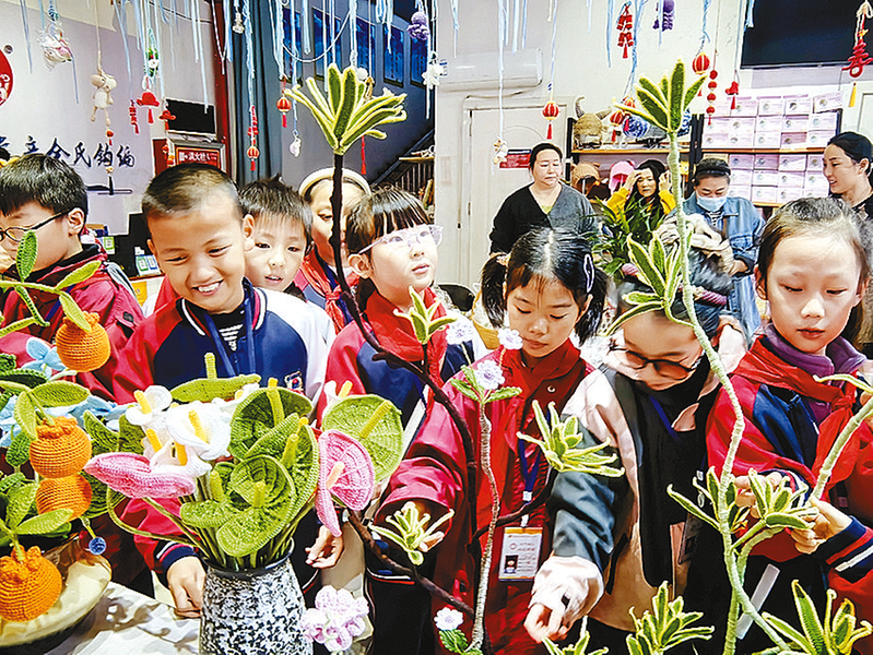 实物观摩更是让小记者们大开眼界。从精致灵动的时尚艺术摆件,到温馨实用的家用杯垫、桌旗等;从独具特色的毛衣、围巾、发夹等,到蕴含城市记忆的旅游伴手礼,再到巧妙点缀空间的艺术装置……一件件色彩斑斓、构思巧妙的钩编工艺品,仿佛在无声地讲述着线与针交织的故事,引得小记者们阵阵惊呼,纷纷俯身端详,感受着丝线背后的温度与情感。