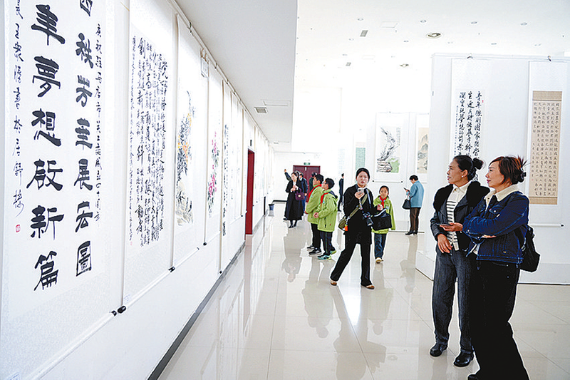 市民在观看作品展 本报讯(文/图 全媒体记者 王永良)10月22日上午,“薪火四十载 丹青绘初心”纪念驻马店市关工委成立40周年书画作品展在市直老干部活动学习中心开幕。