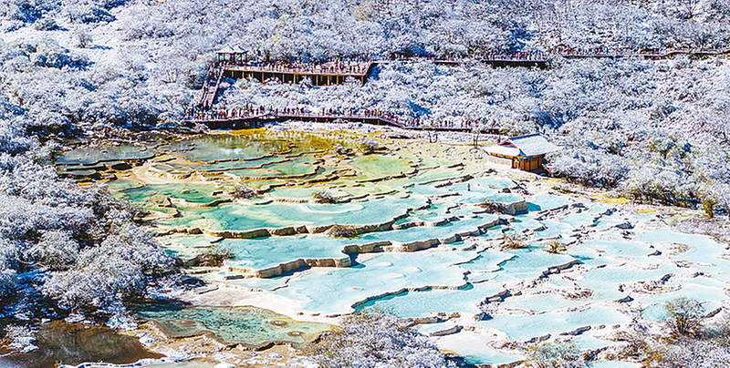 10月21日,四川省阿坝藏族羌族自治州黄龙景区迎来今秋第一场降雪,五彩池与皑皑白雪交相辉映,美不胜收。