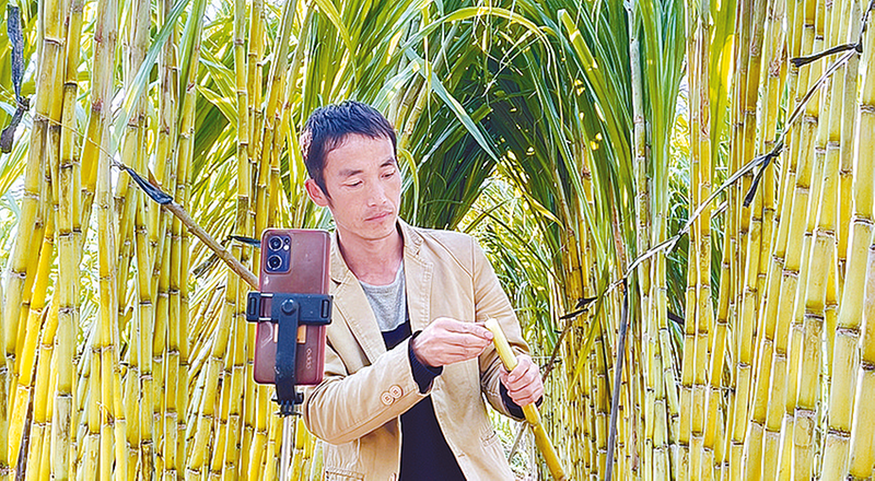 “家人们,我家的甘蔗园采用有机种植,不仅脆甜多汁,剥皮也特别简单,用手就能轻松去皮,就是大家常说的手剥甘蔗,欢迎大家前来品尝。”10月26日,泌阳县花园街道黄楝树社区后葛沟村甘蔗园里,村民袁文生正在利用网络直播推销自家的水果甘蔗(如图)。