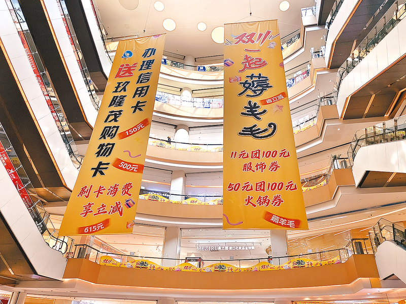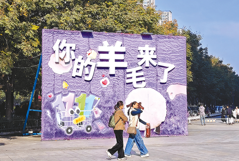 记者在市区乐山大道北段一商场大门口看到,“你的羊毛来了”“双11一起薅羊毛”巨型海报格外醒目,营造出浓厚的节日氛围。走进商场,促销活动更是丰富多样。珠宝、美妆、服饰等区域挂满“买一送一”“第二件1.1折”等优惠海报;中庭悬挂的巨型横幅推出“11元团100元服饰券”“50元团100元火锅券”等大力度优惠。商场还联合多家银行推出办卡赠购物卡活动,最高可获665元购物卡。