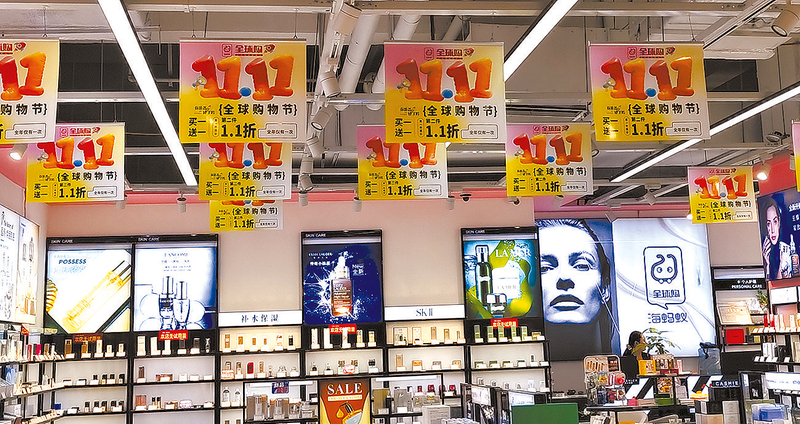 “双11”的购物氛围浓厚 本报讯(文/图 全媒体记者刘金霞)随着“双11”临近,驻马店多家商超提前开启促销模式,线下消费氛围浓厚。11月4日,记者在市区一大型商场看到,从户外海报到店内布置,处处洋溢着“双11”的购物热情,吸引了不少市民前来“薅羊毛”。