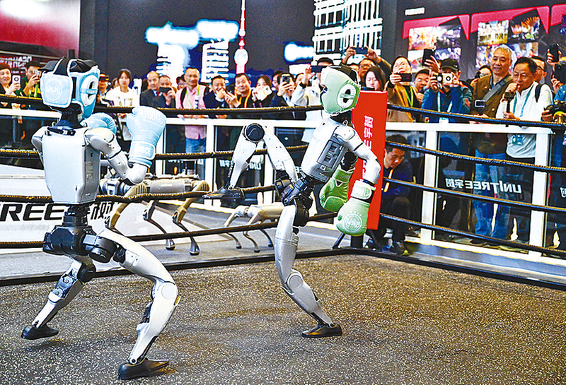 11月6日,在第八届进博会技术装备展区宇树科技展台,两台G1人形机器人的格斗表演吸引了众多观众。它们戴着护具及拳套,施展直拳、勾拳、左右鞭腿,展示倒地自主起身等复杂动作,不时赢得观众喝彩。据介绍,这款亮相表演的人形机器人身高132厘米,体重约35公斤。