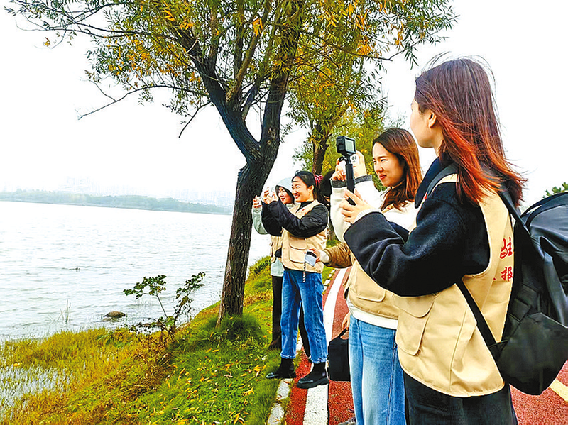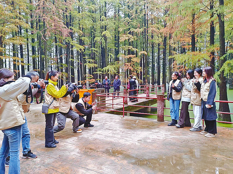 记者在北湖水杉林打卡 本报讯(文/图 全媒体记者 高琳琳 王永良 张朝)11月8日,驻马店日报社编辑记者走进“魅力水城”新蔡,开展了一场沉浸式主题采风活动。大家以笔为媒、以镜为眼,穿梭于千年古县的街巷河湖,驻足于产业园区的生产一线,用文字捕捉发展脉搏,用镜头定格生态之美,全方位、多角度感受新蔡在历史底蕴中焕发的鲜活生机与高质量发展的强劲动能。
