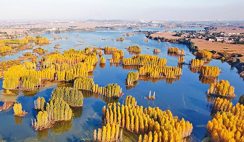 初冬时节,在河北省邢台市隆尧县亦城村泜河沿岸,树叶金黄,与水面、河岸相映衬,勾勒出一幅美丽和谐的自然画卷。