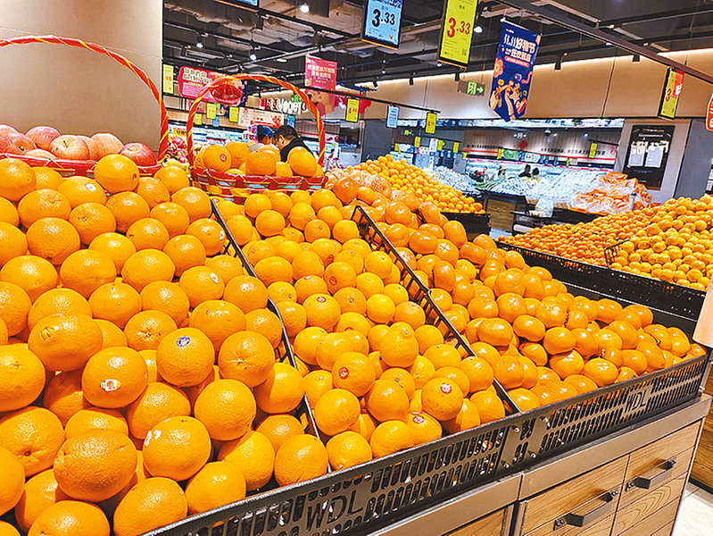 昨日上午,记者在市区一家超市水果区看到,橙黄鲜亮的脐橙、蜜橘占据货架C位(如图),不少市民手提购物袋穿梭其间。