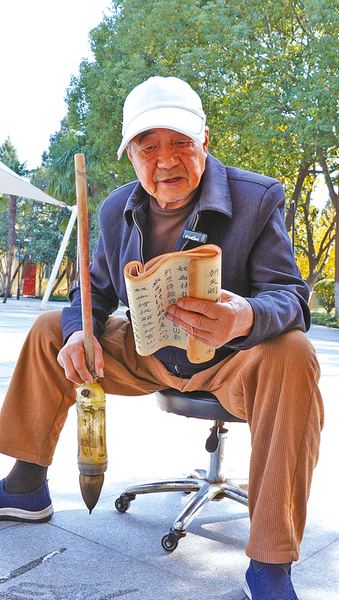 清晨7时,驻马店市区儿童公园的石板路上,84岁的孙光显手持自制的“土毛笔”,以清水为墨,在地面上笔走龙蛇。随着笔端游走,工整的楷书、飘逸的行书逐一显现,引得晨练市民纷纷驻足围观。