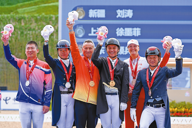 赛后合影 新华社深圳11月12日电(记者肖世尧)12日,第十五届全国运动会马术项目盛装舞步个人赛决赛在深圳举行,38岁的新疆队选手刘涛以72.425分夺得金牌,17岁的上海队选手徐墨菲和52岁的广东队选手顾兵分别以69.520分和69.045分排名二、三位。