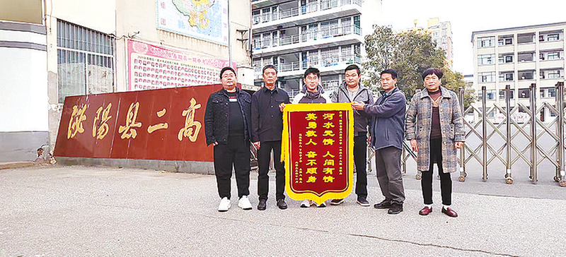 被救者家属来到泌阳县二高向崔颢冉(左三)赠送锦旗