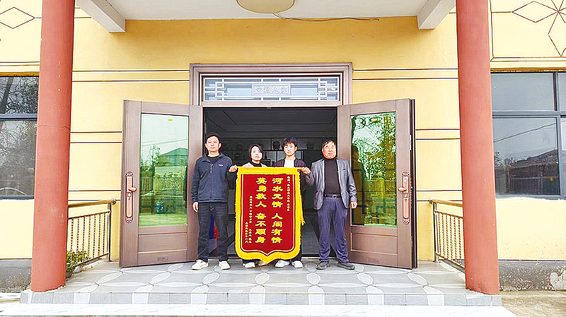李世鑫(右二)、姜长春(右三)母子手拿被救者家属送来的锦 旗 本报讯(文/图 全媒体记者 徐明)连日来,泌阳县二高一名高中生勇救落水儿童的消息在网络上引发网友们称赞。日前,记者来到泌阳县下碑寺乡尚老庄河坝事发地,详细向几位当事人了解当时的情况。