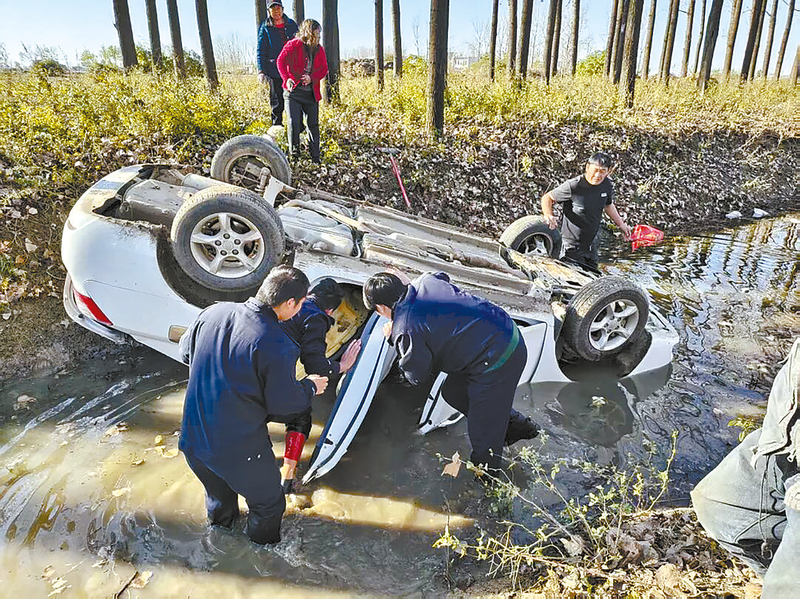 救援现场 本报讯(文/图 全媒体记者 代廷伟 通讯员 冯锦)11月18日14时50分,平舆县万金店镇一乡村道路旁突发交通事故:一辆小型轿车会车时,因司机操作不当,不慎侧翻坠入路边水沟,车内4人被困,情况危急。