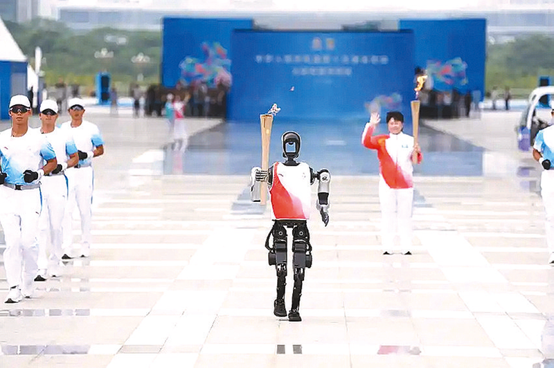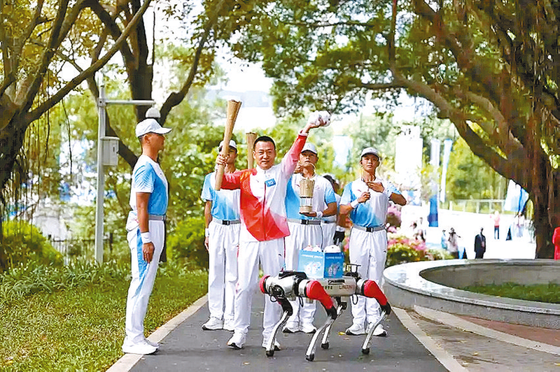 火炬传递中,人形机器人作为首棒火炬手惊艳亮相,机器狗化身“吉祥物守护者”协助传递火炬。
