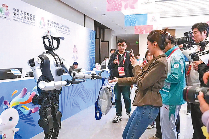 11月14日,人形机器人在拳击男子92公斤级颁 奖仪式上为颁奖嘉宾递上奖牌。 在第十五届全国运动会的赛场上,除了运动员矫健的身影,一群特殊的“工作人员”正悄然改变着我们对体育赛事的认知。