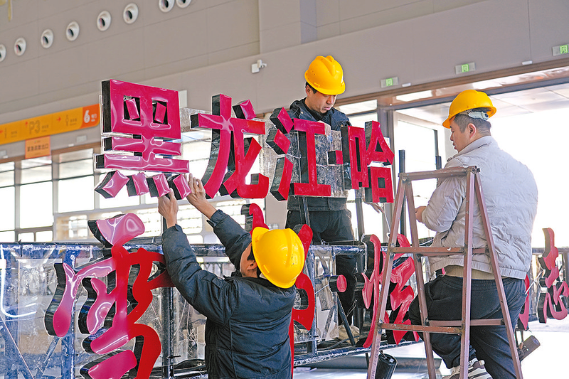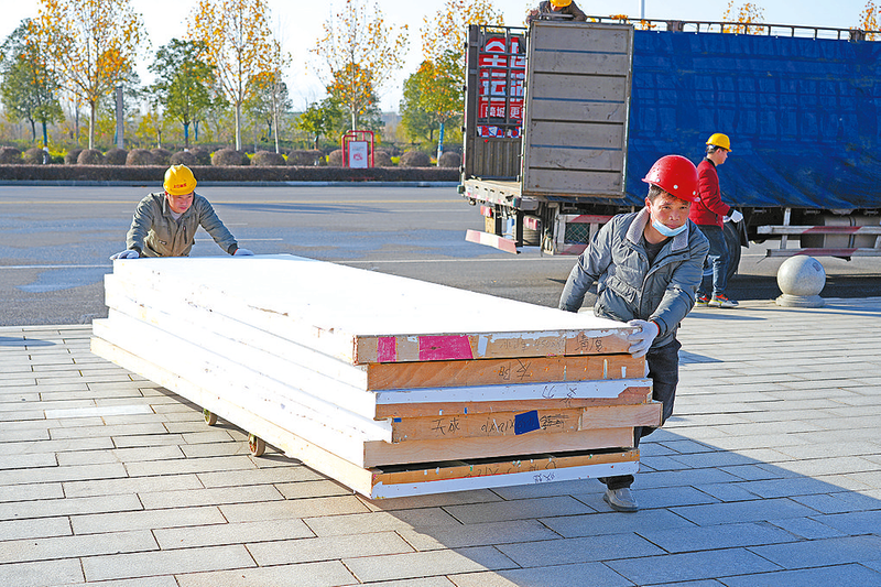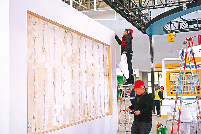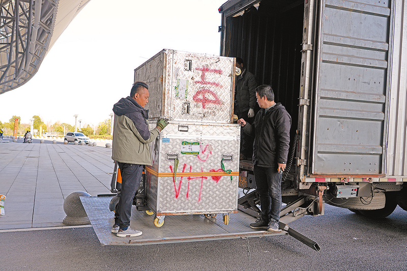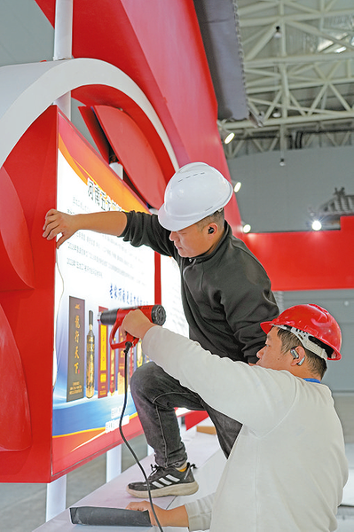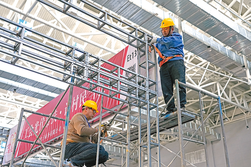 展馆外,满载木质展板、LED显示屏、特色展品的货车有序停靠,叉车穿梭往返运送物资,工人身着工装、佩戴安全帽,默契配合完成装卸搬运,忙而不乱。展厅内,电钻声、铁锤敲击声与施工团队的沟通声交织回荡,构成了热烈的筹备“乐章”。施工人员或攀爬脚手架固定框架,或细致安装展板、调试灯光,或铺设防滑地毯,每一道工序都精益求精。