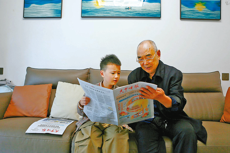 段传义和9岁的重孙一起看《天中晚报》 文/图 全媒体记者 张朝