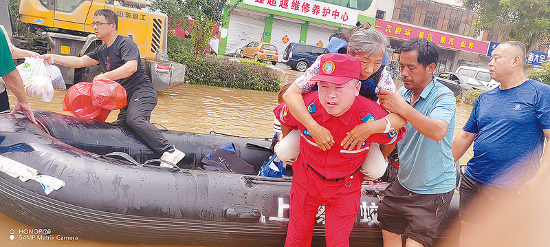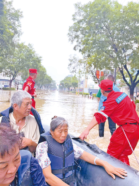 上蔡县蛟龙救援队的志愿者转移被困群众 全媒体记者刘金霞