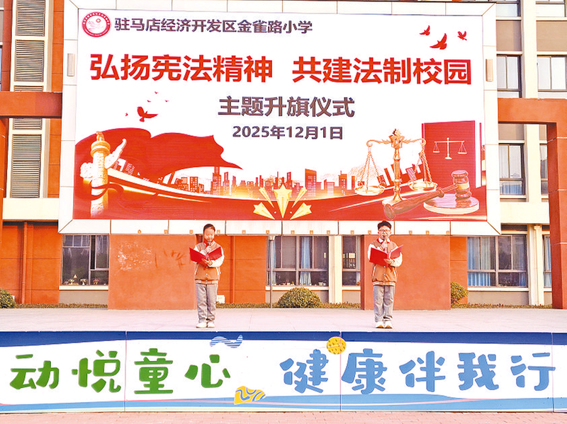 12月1日,驻马店经济开发区金雀路小学以“弘扬宪法精神 共建法治校园”为主题,举行庄严的升旗仪式(如图)。