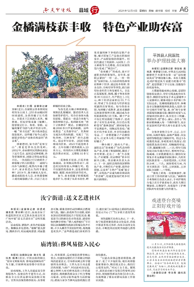 本报讯(文/图 全媒体记者方祥)近日,在泌阳县春水镇刘岗村的东山岗上,250余亩橘园里硕果满枝,金黄的橘子压弯枝头,在阳光下泛着诱人光泽。橘林间,村民穿梭采摘(如图),游客驻足打卡,称重、装箱、运输的繁忙身影与欢声笑语交织,一幅“果丰民富”的丰收画卷正徐徐展开。这些橘子如今已成为泌阳县特色产业助农致富的“黄金果”。