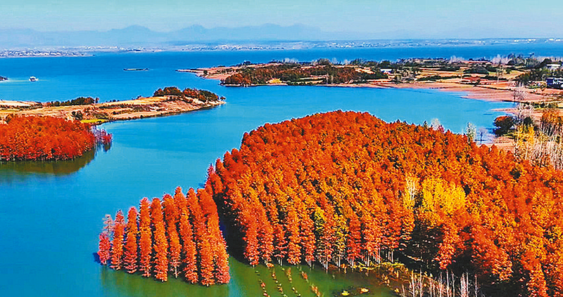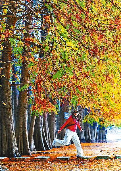 初冬,天中大地层林尽染,确山土门林场、板桥水库李朝京等网红打卡景点换上了斑斓的“彩妆”。火红的水杉、金黄的银杏,水映蓝天,把市区公园装扮成了色彩浓郁、如梦似幻的童话世界。不少市民趁着晴好天气,赏景拍照,定格这份初冬限定美景。 (王建成)
