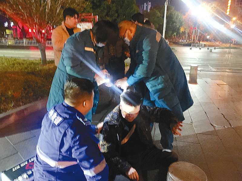 本报讯(文/图 全媒体记者 王永良)12月4日凌晨1时20分,市区文明大道与置地大道交叉口的夜色格外清冷,大多数市民已进入梦乡。驻马店经济开发区天中救援队红十字救护员王闯执行完任务返家途中,看到了路边令人揪心的一幕:一名男子满脸血迹倒在地上,身旁的两轮电动车侧翻在地。没有丝毫犹豫,王闯立即停车,快步冲向受伤男子。