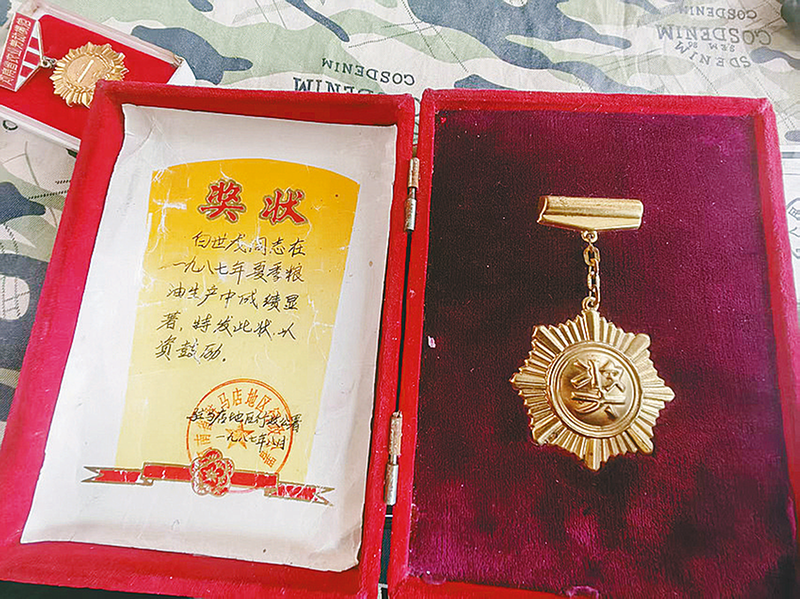 此后多年,白士龙的“劳模故事”仍在续写:1987年8月,他因夏季粮油生产成绩显著,获驻马店地区行政公署颁发的奖状与奖章;1988年,被驻马店地区行政公署评为“年度烟叶生产先进户”;1989年,中共确山县委、确山县人民政府授予他“种粮模范”称号……一本本证书、一枚枚奖章,串联起他扎根乡土的奋斗轨迹。