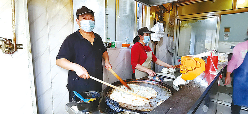 晨光刚爬上市区解放大道西段的梧桐树梢,刘庄巷口的“老金油饼”早已开始忙碌。铁锅里的油花噼啪作响,金喜勇系着蓝围裙站在灶前,手腕轻抖,一张金黄油饼便滑入案板;旁边,妻子范淼熟练地揉着面坯,分切油饼,灶前,浓香的胡辣汤腾起热气,案头那盆大头菜被食客们抢着装盒——“多夹一点!配着饼吃才够味!”这是老金油饼店最寻常的清晨,也是金喜勇夫妇与早餐摊较劲的第25年。