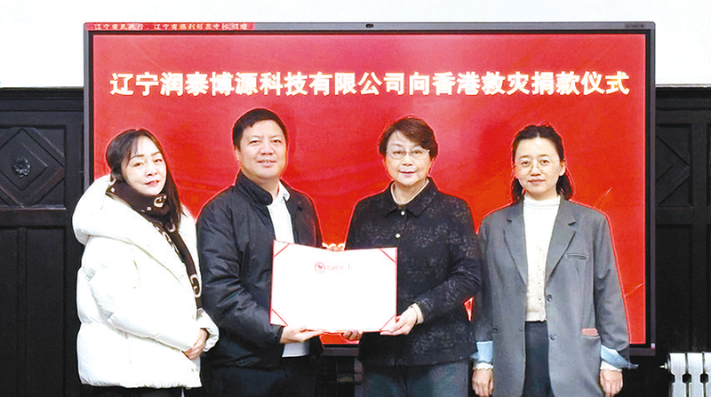 戚景辉(左二)代表辽宁润泰博源科技有限公司向香港救灾捐款(资料图片) 全媒体记者 戚飞 郭建光