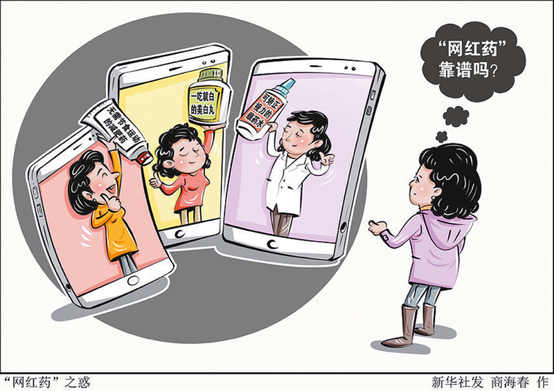 无需节食运动的减肥药、一吃就白的美白丸、可矫正视力的眼药水……近年来,不少“网红药”风靡市场。直播间内的“限时抢购”、社交平台上的“种草攻略”、朋友圈里的“熟人背书”,吸引网民跟风购买。