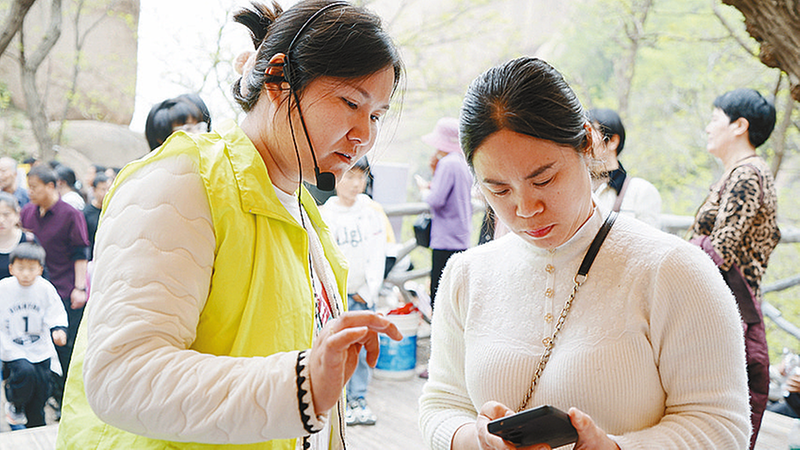 景区工作人员(左)热心服务游客 本报讯(文/图 全媒体记者 王晓晶)近日,嵖岈山景区启动新一轮提质升级行动,通过基础设施更新与环境深度清理双管齐下,在提升游客体验的同时,向广大游客发出共建共享文明之旅的倡议,让文明旅游成“最美风景”。