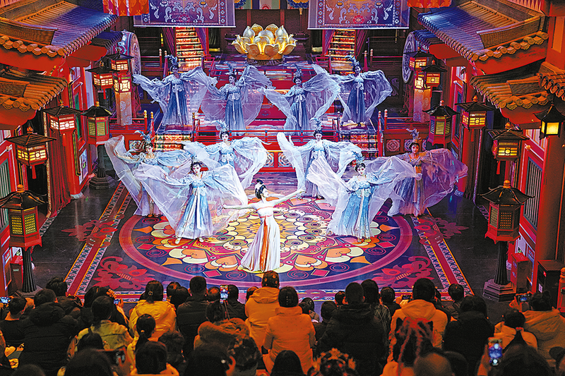 12月23日,演员在街区内表演大唐乐舞《霓裳羽衣舞》。