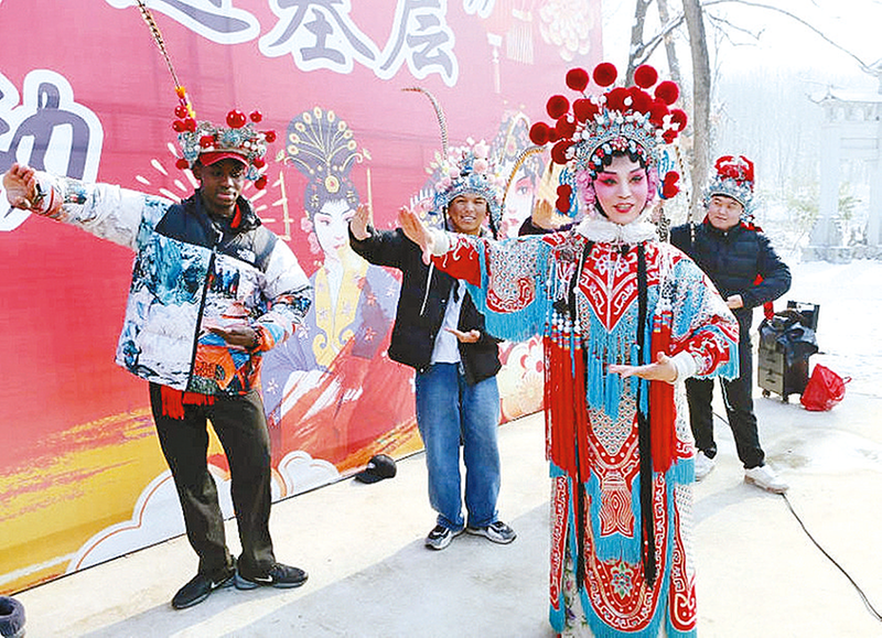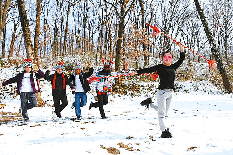 “哇,雪后的金顶山像童话世界一样!”在辅导老师白海峰的带领下,外籍留学生们首先踏入银装素裹的金顶山风景区。恰逢驻马店宏扬豫剧团“舞台艺术送基层”演出在此上演,悠扬的唱腔、灵动的水袖瞬间吸引了众人的目光。他们驻足凝望舞台,眼神里满是好奇与沉醉。演出间隙,学生们走向后台,演员们见状热情相迎,手把手传授经典戏曲动作。“手腕要稳,脚步要跟紧节奏”,演员们耐心示范,即便身着单薄戏服在寒风中穿梭,也毫无怨言;学生们学得格外认真,抬手、转身、迈步,一招一式有板有眼,时而蹙眉琢磨,时而露出豁然开朗的笑容。