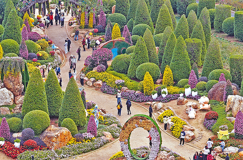 1月3日,游客在广西南宁市青秀山风景区观赏菊花(无人机照片)。
