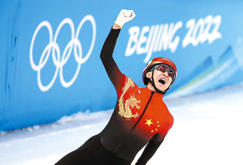 中国短道速滑奥运冠军武大靖6日官宣退役。图为2022年2月5日,在北京2022年冬奥会短道速滑项目混合团体接力决赛后,中国队选手武大靖庆祝中国队夺冠。
