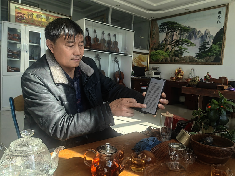 王金堂向记者展示国外媒体对他制作的提琴的评价 全媒体记者 许伟/摄