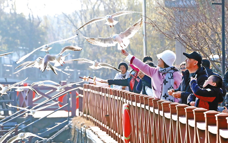 1月10日,游客在苏州市吴中区光福镇冲山村的太湖旁观赏红嘴鸥。 新华社发(杭兴微/摄)