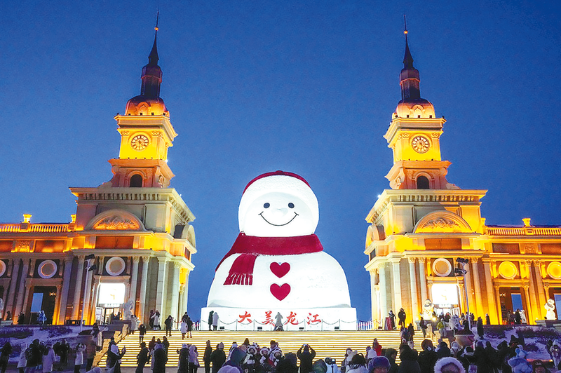 1月10日,游客在哈尔滨市群力音乐公园的大雪人前打卡拍照。 新华社记者 王建威/摄